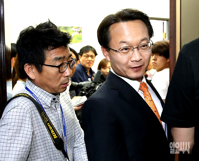 26일, 서울 여의도 국회 새누리당 원내수석부대표실에서 공무원연금개혁 관련 여야 원내수석부대표 회동을 앞둔 조해진 새누리당 원내수석부대표가 새정치민주연합 이춘석 원내수석부대표와 회동을 미루고 밖으로 나서고 있다.