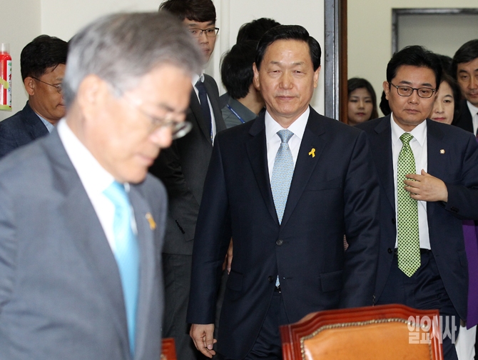 새정치민주연합 문재인 대표와 김상곤 혁신위원장 등 지도부가 27일 오전 서울 여의도 국회에서 열린 최고위원회의에 참석하고 있다.