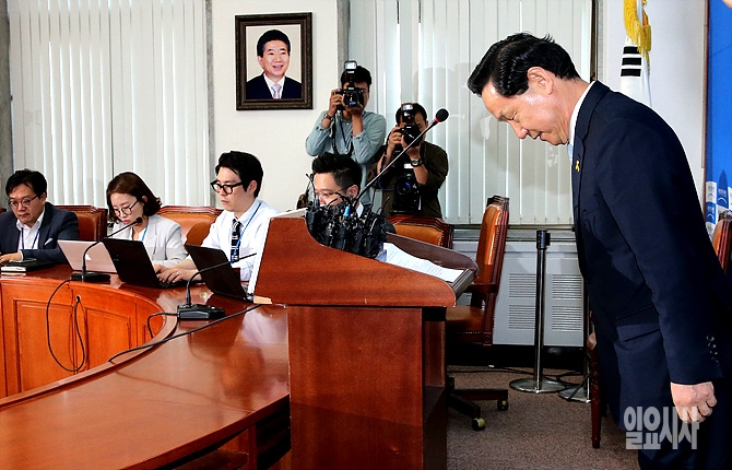27일, 김상곤 새정치민주연합 혁신위원장이 서울 여의도 국회 새정치민주연합 당 대표실서 열린 기자회견에 앞서 인사하고 있다.