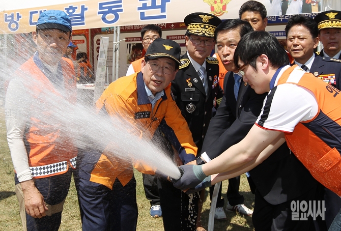 박원순 서울시장이 27일 오전 서울 한강잠원지구 트랙경기장에서 열린 서울시 종합소방기술경연대회에 참석해 화재진압 체험을 하고 있다.