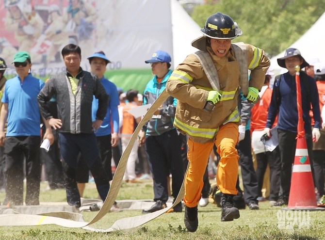 27일 오전 서울 한강잠원지구 트랙경기장에서 열린 서울시 종합소방기술경연대회에서 대회에 참가한 소방대원이 소방호스 끌기 경주를 벌이고 있다.