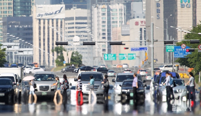 서울의 최고기온이 31도를 기록한  27일 오후 서울 여의도공원 앞 횡단보도에서 시민들이 무더위에 발걸음을 재촉하고 있다.