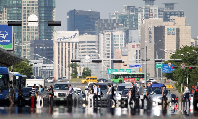 서울의 최고기온이 31도를 기록한  27일 오후 서울 여의도공원 앞 횡단보도에서 시민들이 무더위에 발걸음을 재촉하고 있다.