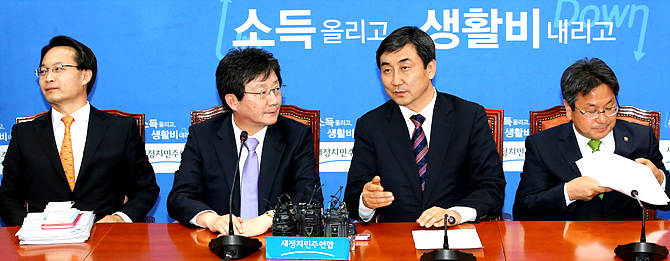27일, 서울 여의도 국회 새정치민주연합 회의실에서 유승민-이종걸 여야 원내대표, 조해진-강기정 원내수석부대표가 만나 여야 회동을 갖고 있는 가운데, 두 원내대표가 공무원 연금 문제와 관련해 이야기를 나누고 있다.