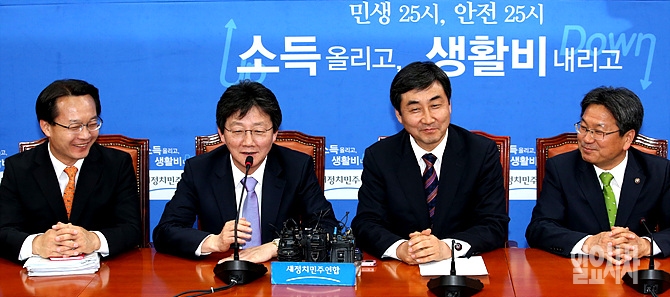 27일, 서울 여의도 국회 새정치민주연합 회의실에서 유승민-이종걸 여야 원내대표, 조해진-강기정 원내수석부대표 등 원내지도부가 만나 여야 회동을 갖고 있는 가운데, 유 원내대표가 공무원 연금 문제와 관련해 발언을 하고 있다.