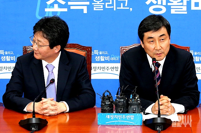 27일, 서울 여의도 국회 새정치민주연합 회의실에서 유승민-이종걸 여야 원내대표, 조해진-강기정 원내수석부대표 등 원내지도부가 만나 여야 회동을 갖고 있는 가운데, 이 원내대표의 발언 도중 유 원내대표가 잠시 고개를 돌리고 있다.