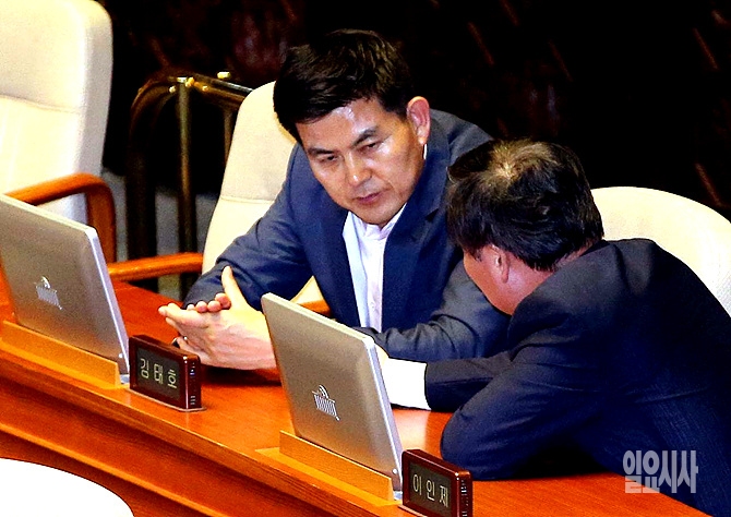 24일, 서울 여의도 국회 본회의장서 열린 정치분야 대정부질문에 앞서 새누리당 김태호 의원와 김재원 의원이 심각한 표정으로 이야기를 나누고 있다.