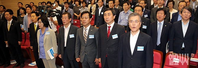 20일, 서울 여의도 국회서 열린 '새정치민주연합 제1차 중앙위원회의'에 앞서 문재인 대표 등 참석자들이 애국가 제창을 하고 있다.