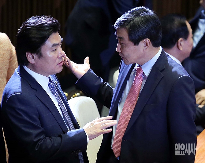 8일, 서울 여의도 국회에서 대법관 임명동의안 표결 등의 안건이 처리된 후 산회가 선언되자, 원유철-이종걸 여야 원내대표가 잠시 대화를 나누고 있다.