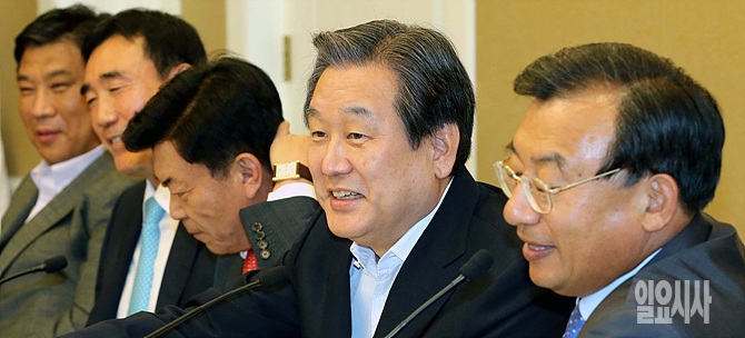 9일, 서울 여의도 국회서 열린 '중소기업·소상공인 특위' 5차 회의 도중 새누리당 김무성 대표와 이정현 위원장이 잠시 웃음 짓고 있다.