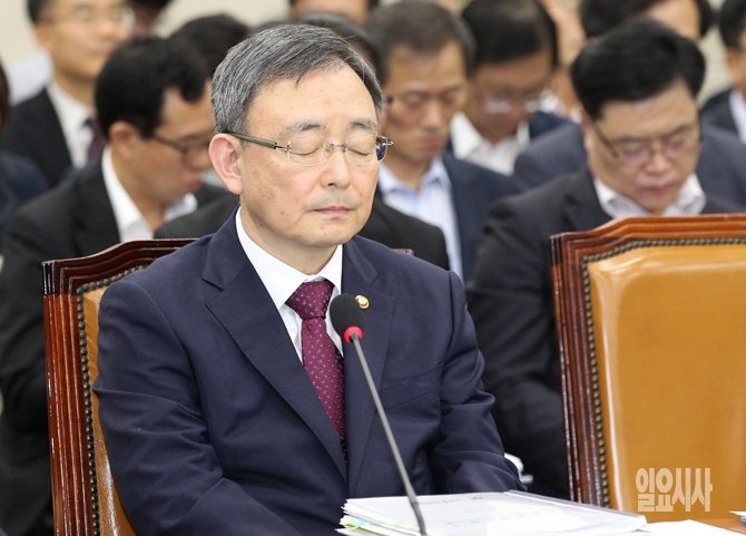 최성준 방송통신위원장이 10일 오전 서울 여의도 국회에서 열린 국회 미래창조과학방송통신위원회 국정감사에서 생각에 잠긴듯 눈을 감고 있다.