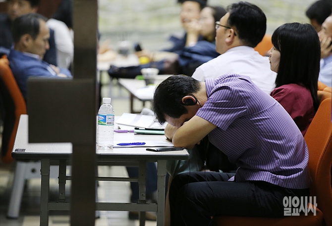 국정감사 첫날인 10일, 서울 여의도 국회 한 상임위 국감장 휴게실에 피감기관 관계자가 책상에 머리를 대고 휴식을 취하고 있다.