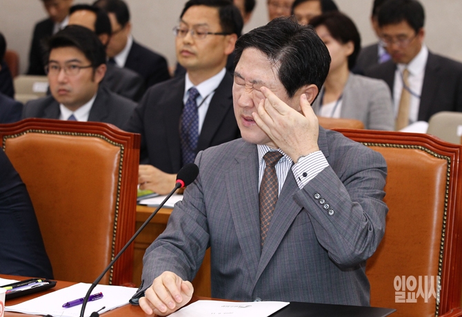 유기준 해양수산부 장관이 11일 오전 서울 여의도 국회에서 열린 국회 농림축산식품해양수산위원회 국정감사에서 눈을 만지고 있다.