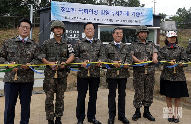11일, 경기도 파주에 소재한 육군1사단 11연대 백학대대를 찾은 정의화 국회의장(사진 왼쪽서 두 번째), 황진하 새누리당 원내대표 등이 병영독서카페 기증식에서 테이프커팅을 하고 있다. (사진공동취재단)