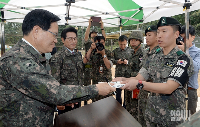 11일, 경기도 파주에 소재한 육군1사단 11연대 백학대대를 찾은 정의화 국회의장이 병영독서카페 기증식 직후 한 장병에게 책을 증정하고 있다. (사진공동취재단)
