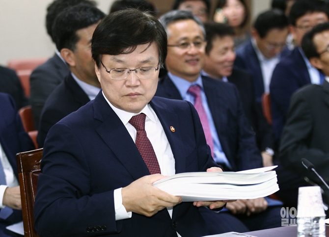 최양희 미래창조과학부 장관이 14일 오전 경기도 정부과천종합청사에서 열린 국회 미래창조과학방송통신위원회의 미래창조과학부 등에 대한 국정감사에서 자료를 정리하고 있다.