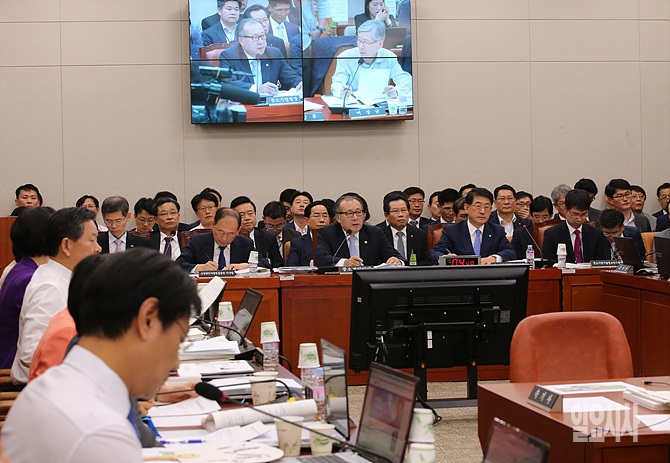 14일, 서울 여의도 국회서 열린 중소기업청 등 산업통상자원위원회 국정감사에서 한정화 중소기업청장이 의원들의 질의에 답변하고 있다.