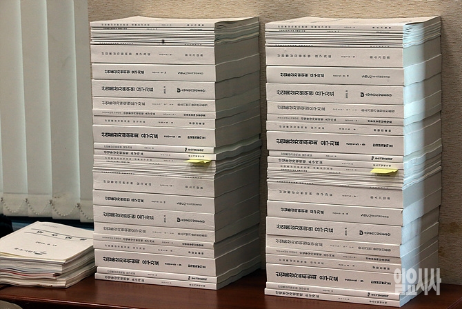 14일, 서울 여의도 국회서 산업통상자원위원회 국정감사가 열린 가운데 회의실 구석에 위원회측에서 요구한 요구자료 책자들이 쌓여 있다.