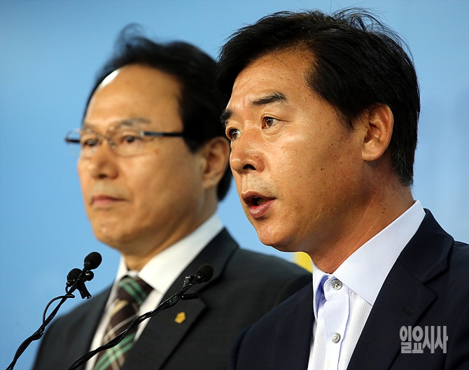 14일, 서울 여의도 국회 정론관에서 새정치민주연합 오중기 경북도당위원장(사진 오른쪽)과 조기석 대구시당위원장이 7개 도시당위원장 공동성명서를 발표하고 있다. 이들은 이날 "당 혁신위원회의 혁신안을 전폭적으로 지지한다"고 밝혔다.