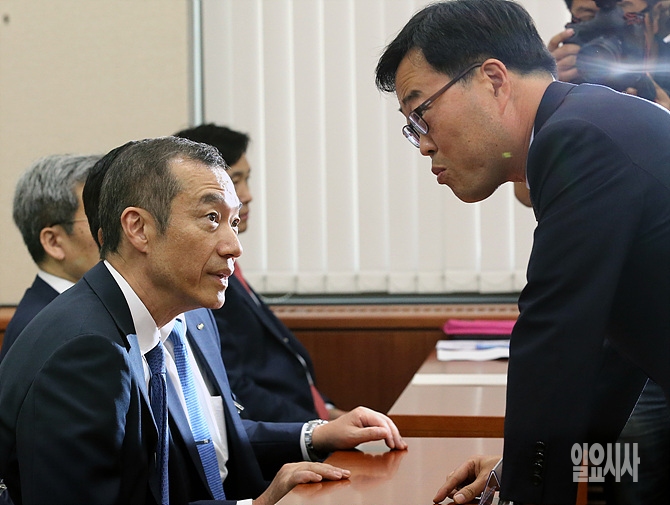 14일, 서울 여의도 국회서 열린 금융위원회 등에 대한 정무위원회 국정감사 정회 직후 새정치민주연합 김기식 의원(사진 오른쪽)이 증인으로 출석한 최치훈 삼성물산 대표와 이야기를 나누고 있다.