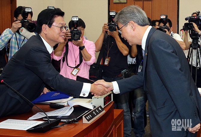 14일, 서울 여의도 국회서 열린 금융위원회 등에 대한 정무위원회 국정감사에 앞서 정우택 정무위원장이 임종룡 금융위원장과 악수를 나누고 있다.