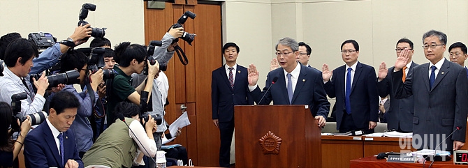14일, 서울 여의도 국회서 열린 금융위원회 등에 대한 정무위원회 국정감사에 출석한 임종룡 금융위원장이 선서를 하고 있는 가운데, 취재진의 취재열기가 달아오르고 있다.