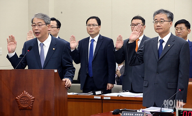 14일, 서울 여의도 국회서 열린 금융위원회 등에 대한 정무위원회 국정감사에 앞서 출석한 임종룡 금융위원장 및 정찬우 부위원장 등이 성실한 답변을 하겠다며 선서를 하고 있다.