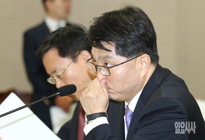 진웅섭 금융감독원장이 15일 오전 서울 여의도 금융감독원에서 열린 국회 정무위원회의 금융감독원에 대한 국정감사에서 곤혹스러운 표정을 짓고 있다.