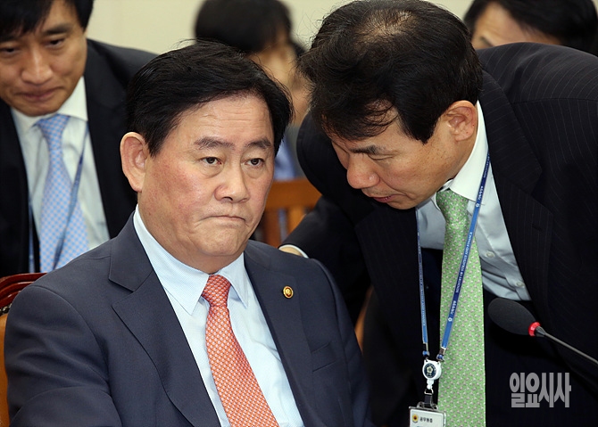 15일, 서울 여의도 국회서 열린 기획재정부에 대한 국정감사에서 최경환 경제부총리 겸 기획재정부장관이 의원들의 질의에 답변하던 도중 관계자로부터 보고받고 있다.