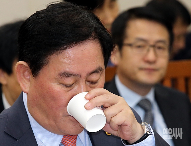 15일, 서울 여의도 국회서 열린 기획재정부에 대한 국정감사 도중 최경환 경제부총리 겸 기획재정부장관이 목이 타는 듯 물을 들이키고 있다.