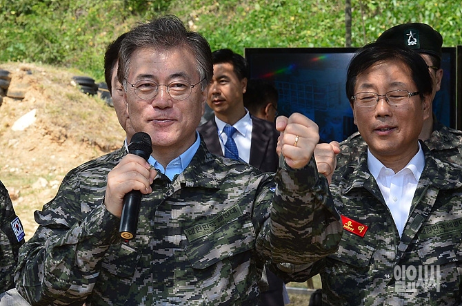 15일, 인천시 옹진군 연평도 해병대 부대를 방문한 국회 국방위(위원장 정두언) 소속의 문재인 위원 등 국방위원들이 파이팅을 외치고 있다. (사진공동취재단)