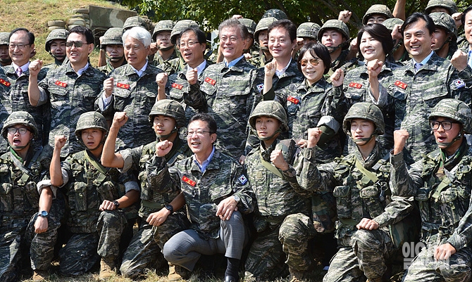 15일, 인천시 옹진군 연평도 해병대 부대를 방문한 국회 국방위(위원장 정두언) 위원들이 군장병들과 함께 파이팅을 외치고 있다. (사진공동취재단)