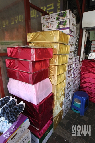 15일 오후 서울 동대문구 청량리 청과물시장에 추석을 앞두고 보자기로 포장된 과일선물세트가 쌓여 있다.