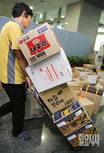 15일, 서울 여의도 국회 의원회관에 한 택배사 직원이 추석선물 택배를 나르고 있다.