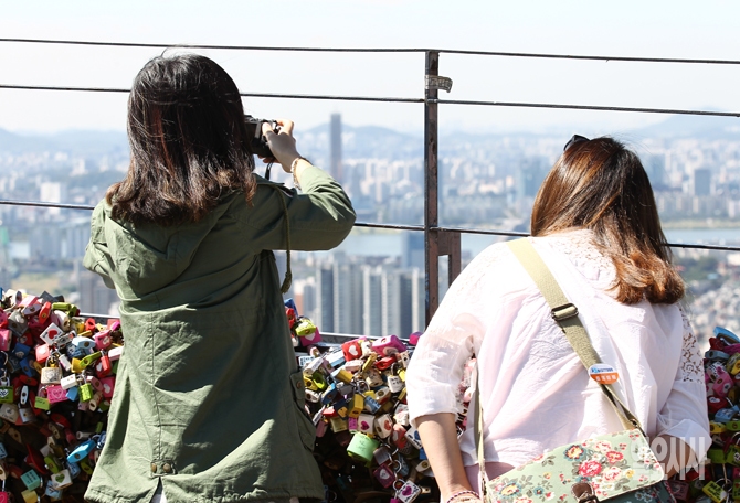 중국인 관광객들이 16일 오전 서울 남산에서 화창한 가을날씨를 즐기며 기념사진을 촬영하고 있다.