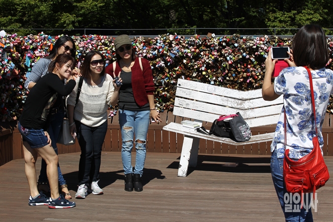 중국인 관광객들이 16일 오전 서울 남산에서 화창한 가을날씨를 즐기며 기념사진을 촬영하고 있다.