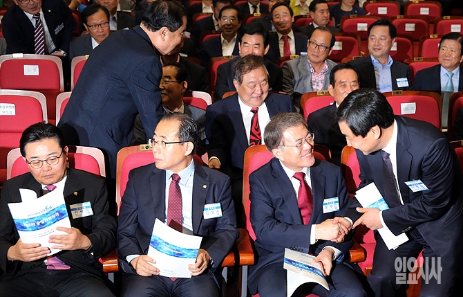 16일, 서울 여의도 국회 의원회관서 열린 새정치민주연합 제2차 중앙위원회에 앞서 문재인 새정치민주연합 대표와 이종걸 원내대표가 반갑게 악수를 나누고 있다.