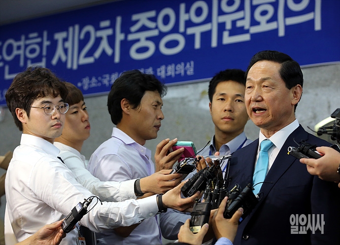 16일, 서울 여의도 국회 의원회관서 열린 새정치민주연합 제2차 중앙위원회에 앞서 김상곤 혁신위원장이 취재진의 질문에 답변하고 있다.