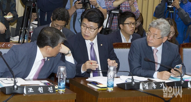 조원진, 정용기, 이철우 새누리당 의원(왼쪽부터)이 17일 오전 서울특별시청 신청사에서 열린 국회 안전행정위원회 국정감사에서 논의를 하고 있다.