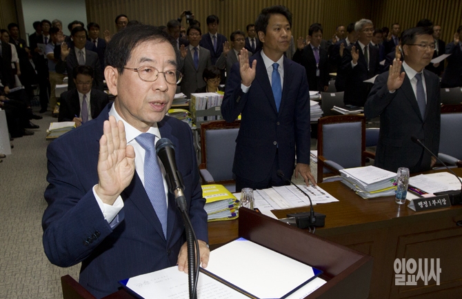 박원순 서울시장이 17일 오전 서울특별시청 신청사에서 열린 국회 안전행정위원회 국정감사에서 선서를 하고 있다.