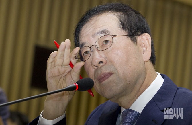 박원순 서울시장이 17일 오전 서울특별시청 신청사에서 열린 국회 안전행정위원회 국정감사에서 안경을 만지고 있다.