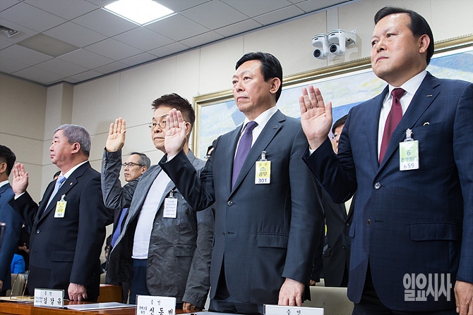 17일, 서울 여의도 국회 정무위원회 국정감사에 신동빈 롯데그룹 회장 등이 증인으로 출석한 가운데 국감에 앞서 선서를 하고 있다.