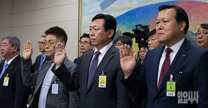 17일, 서울 여의도 국회 정무위원회 국정감사에 신동빈 롯데그룹 회장 등이 증인으로 출석한 가운데 국감에 앞서 선서를 하고 있다.