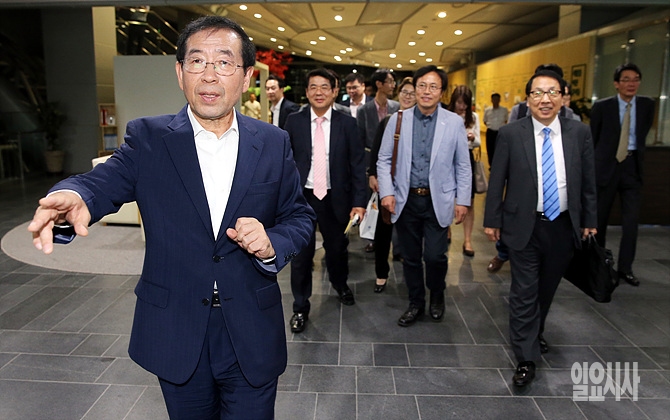17일, 서울 중구 서울시청 간담회장에서 박원순 서울시장 초청 세종포럼 토론회가 열린 가운데, 박 시장이 참석자들을 안내하고 있다.