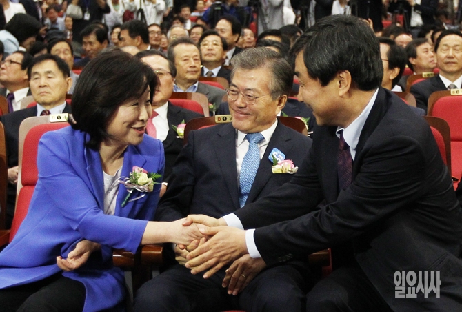 심상정 정의당 대표와 새정치민주연합 문재인 대표, 이종걸 원내대표가 18일 오전 서울 여의도 국회의원회관에서 열린 새정치민주연합 창당 60주년 기념식에서 인사를 나누고 있다.