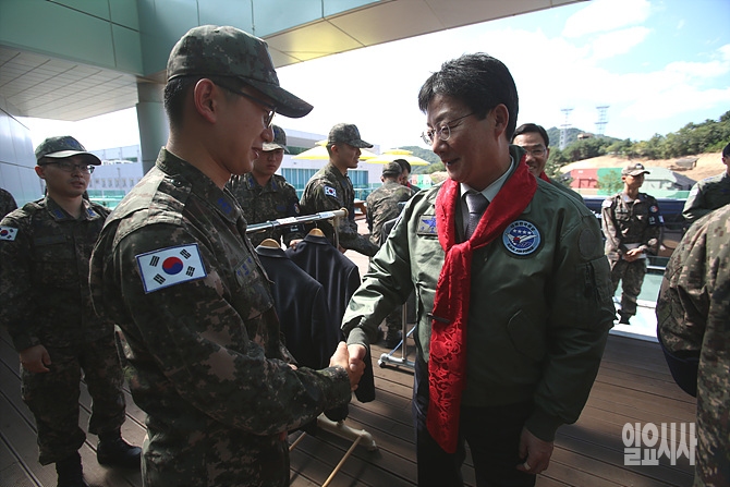 18일, 국회 국방위원회(위원장 정두언) 의원들이 강원도 원주 제8전투비행단 국정감사 현지시찰에 나선 가운데, 새누리당 유승민 의원이 한 장병과 악수를 나누고 있다.
