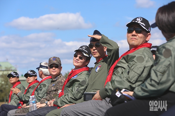 18일, 국회 국방위원회(위원장 정두언) 소속 여야 의원들이 강원도 원주 제8전투비행단 국정감사 현지시찰에서 빨간마후라를 목에 두르고 비행단의 시범을 보고 있다.