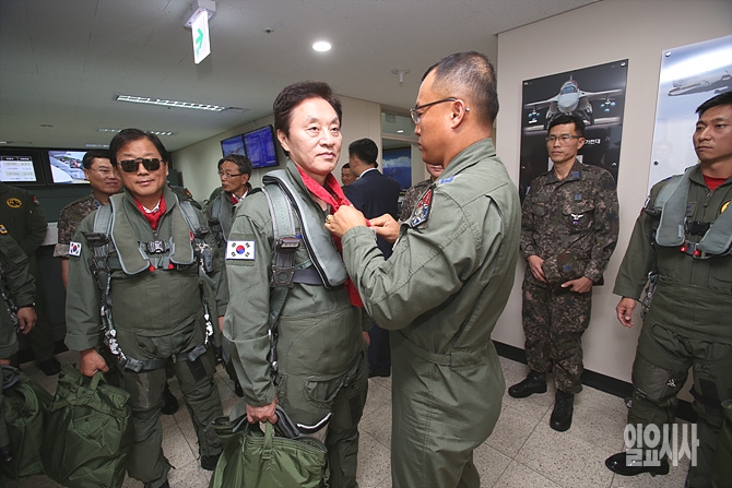 18일, 군 관계자가 정두언 국회 국방위원장이 제8전투비행단 국정감사 현지시찰에 앞서, 정두언 국방위원장에게 빨간마후라를 둘러주고 있다.