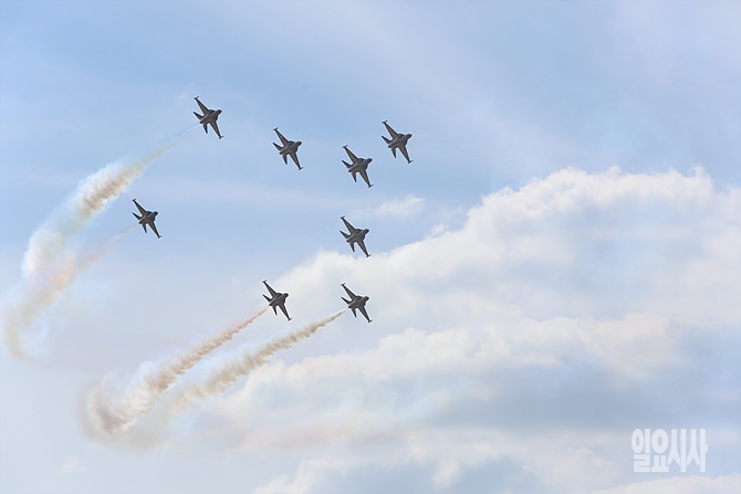 18일, 강원도 원주 제8전투비행단 국정감사 현지시찰에서 블랙이글이 시범비행을 보이고 있다.