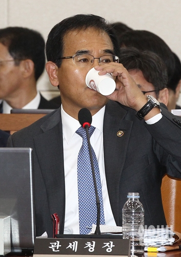 김낙회 관세청장이 18일 오후 서울 여의도 국회에서 열린 국회 기획재정위원회 국정감사에서 물을 마시고 있다.